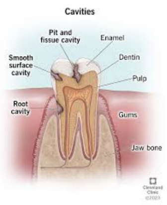 What is tooth decay? Tooth decay is the breakdown of a tooth's structure, caused by bacteria in the mouth that feed on sugars and produce acids. These acids create plaque, a sticky film that erodes the tooth's hard outer layer, enamel. Over time, this can lead to a hole called a cavity, which may cause pain, sensitivity, and eventually infection... read more »